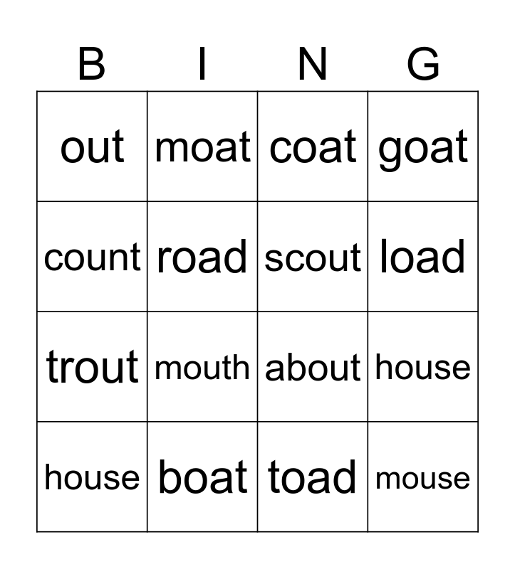 This bingo card has 16 words: boat, house, coat, out, trout, moat, about, toad, count, road, house, goat, mouth, load, scout and mouse.