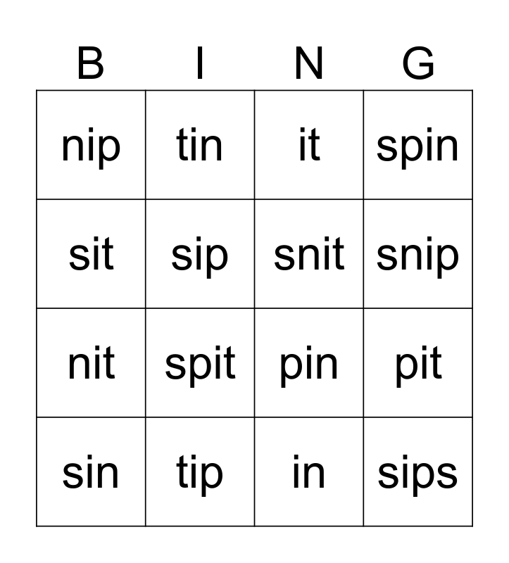 This bingo card has 16 words: tip, pit, it, nip, nit, tin, pin, in, sit, sip, sin, spin, spit, snip, snit and sips.