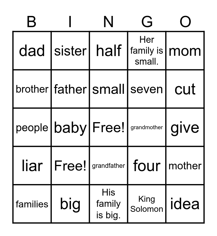 This bingo card has a free space and 24 words: Free!, big, small, families, mom, dad, brother, sister, grandmother, grandfather, seven, people, four, mother, father, King Solomon, give, half, cut, baby, idea, liar, Her family is small. and His family is big..