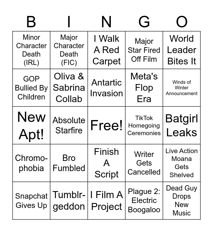 This bingo card has a free space and 24 words: Bro Fumbled, Tumblr- geddon, Antartic Invasion, Snapchat Gives Up, World Leader Bites It, Minor Character Death (IRL), GOP Bullied By Children, Major Character Death (FIC), TikTok Homegoing Ceremonies, Finish A Script, Meta's Flop Era, New Apt!, Writer Gets Cancelled, Live Action Moana Gets Shelved, Oliva & Sabrina Collab, Plague 2: Electric Boogaloo, Batgirl Leaks, I Walk A Red Carpet, Winds of Winter Announcement, Absolute Starfire, Dead Guy Drops New Music, Chromo- phobia, Major Star Fired Off Film and I Film A Project.