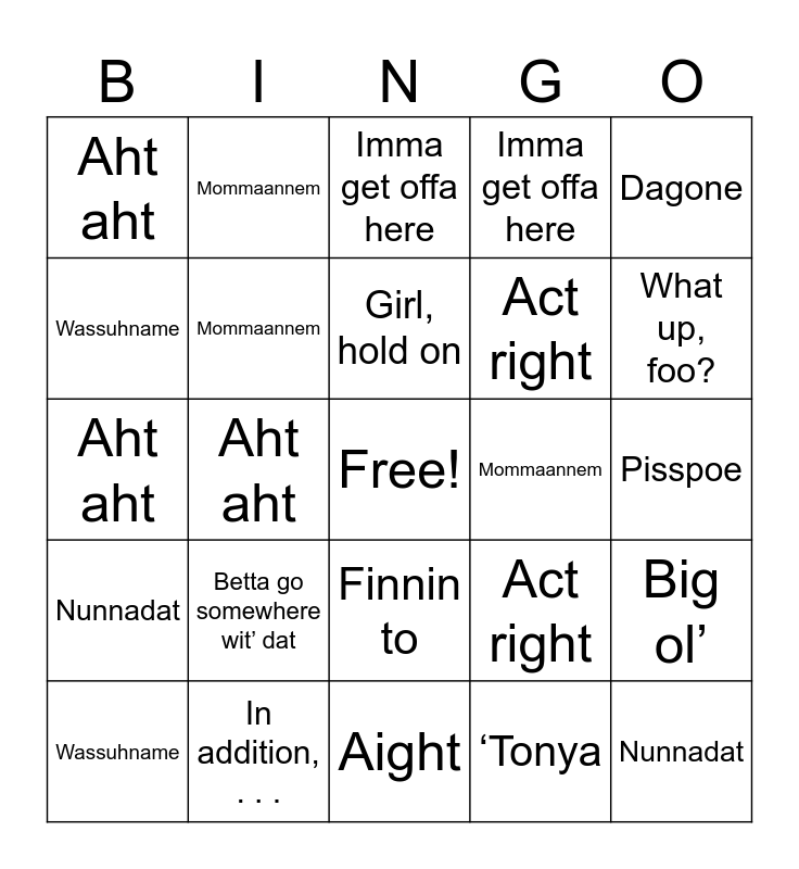 This bingo card has a free space and 57 words: Pisspoe, Wassuhname, Dagone, Aht aht, Aight, Nunnadat, Mommaannem, Finnin to, Act right, Boo boo da foo, Imma get offa here, See, dis/dat right here, Girl, hold on, Betta go somewhere wit’ dat, Pisspoe, Wassuhname, Dagone, Aht aht, Aight/Aight den, Nunnadat, Mommaannem, Finnin to, Act right, Imma get offa here, See, dis/dat right here, Girl, hold on, Betta go somewhere wit’ dat, In addition, . . ., What up, foo?, She’s on the porch., Okay, girl, ‘Tonya, Tuh, I know das right, Pisspoe, Wassuhname, Dagone, Aht aht, Aight/Aight den, Nunnadat, Mommaannem, Finnin to, Act right, Imma get offa here, See, dis/dat right here, Girl, hold on, Betta go somewhere wit’ dat, In addition, . . ., What up, foo?, She’s on the porch., Okay, girl, ‘Tonya, Tuh, I know das right, Prolly (Nae shrug), Big ol’ and Exactly.