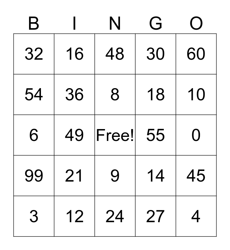 This bingo card has a free space and 24 words: 21, 12, 8, 3, 60, 32, 54, 16, 55, 9, 18, 6, 14, 45, 36, 27, 0, 48, 10, 49, 4, 99, 30 and 24.
