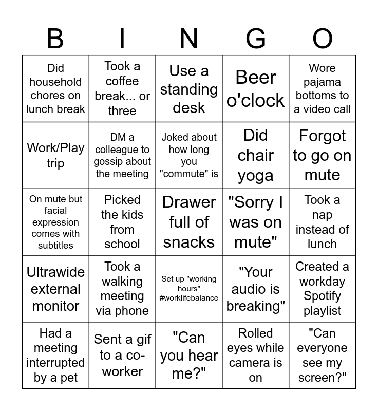 This bingo card has 25 words: Took a walking meeting via phone, "Can you hear me?", Joked about how long you "commute" is, Had a meeting interrupted by a pet, Wore pajama bottoms to a video call, Did household chores on lunch break, Work/Play trip, Took a coffee break... or three, "Sorry I was on mute", Set up "working hours" #worklifebalance, Did chair yoga, On mute but facial expression comes with subtitles, "Your audio is breaking", Created a workday Spotify playlist, DM a colleague to gossip about the meeting, "Can everyone see my screen?", Took a nap instead of lunch, Use a standing desk, Forgot to go on mute, Picked the kids from school, Drawer full of snacks, Sent a gif to a co-worker, Ultrawide external monitor, Beer o'clock and Rolled eyes while camera is on.