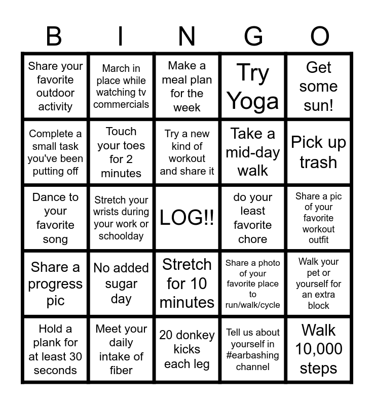This bingo card has a free space and 24 words: No added sugar day, Meet your daily intake of fiber, Try a new kind of workout and share it, Hold a plank for at least 30 seconds, Get some sun!, Share your favorite outdoor activity, Complete a small task you've been putting off, March in place while watching tv commercials, do your least favorite chore, Stretch for 10 minutes, Take a mid-day walk, Dance to your favorite song, Share a photo of your favorite place to run/walk/cycle, Walk your pet or yourself for an extra block, Touch your toes for 2 minutes, Tell us about yourself in #earbashing channel, Share a pic of your favorite workout outfit, Make a meal plan for the week, Pick up trash, Stretch your wrists during your work or schoolday, Walk 10,000 steps, Share a progress pic, Try Yoga and 20 donkey kicks each leg.