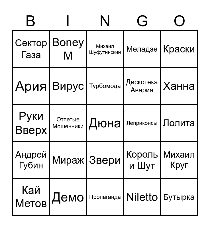 This bingo card has 41 words: Жуки, Руки Вверх, Иванушки, Вирус, Демо, Звери, Турбомода, Тату, Краски, Андрей Губин, Отпетые Мошенники, Меладзе, Дюна, Лолита, Леприконсы, Мираж, Кар-Мен, Сектор Газа, Мумий Тролль, Михаил Шуфутинский, Михаил Круг, Бутырка, Пропаганда, Дискотека Авария, Филипп Киркоров, Клава Кока, Niletto, Тимати, Ханна, Feduk, СССatch, Boney M, Кай Метов, Nirvana, Король и Шут, Ария, Panjabi MC, AC-DC, Алёна Апина, ACE of BASE and AQUA.
