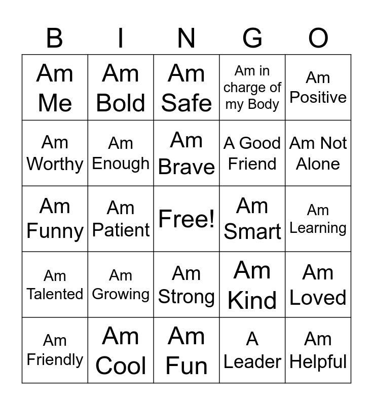 This bingo card has a free space and 24 words: Am Growing, Am Cool, Am Brave, Am Friendly, Am Positive, Am Me, Am Worthy, Am Bold, Am Smart, Am Strong, A Good Friend, Am Funny, Am Kind, Am Loved, Am Enough, A Leader, Am Learning, Am Safe, Am Not Alone, Am Patient, Am Helpful, Am Talented, Am in charge of my Body and Am Fun.