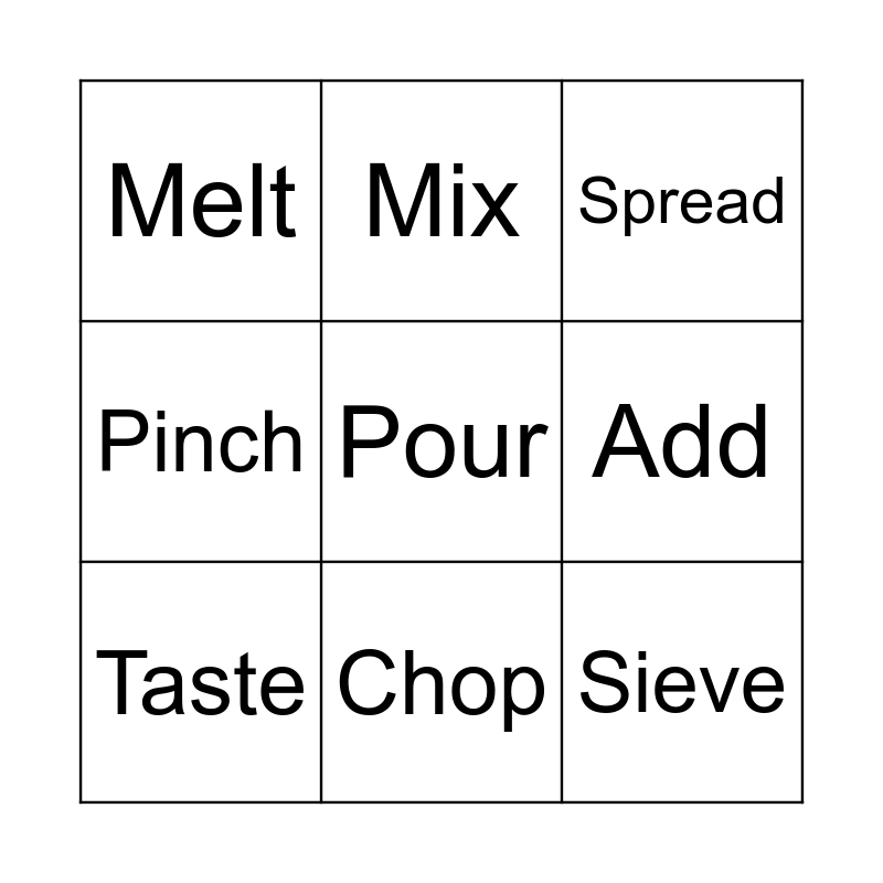 This bingo card has 22 words: Grate, Fry, Mix, Roll, Add, Taste, Melt, Spread, Whisk, Stir, Sieve, Pinch, Toast, Bake, Cut, Crack, Scramble, Peel, Dip, Pour, Chop and Add.