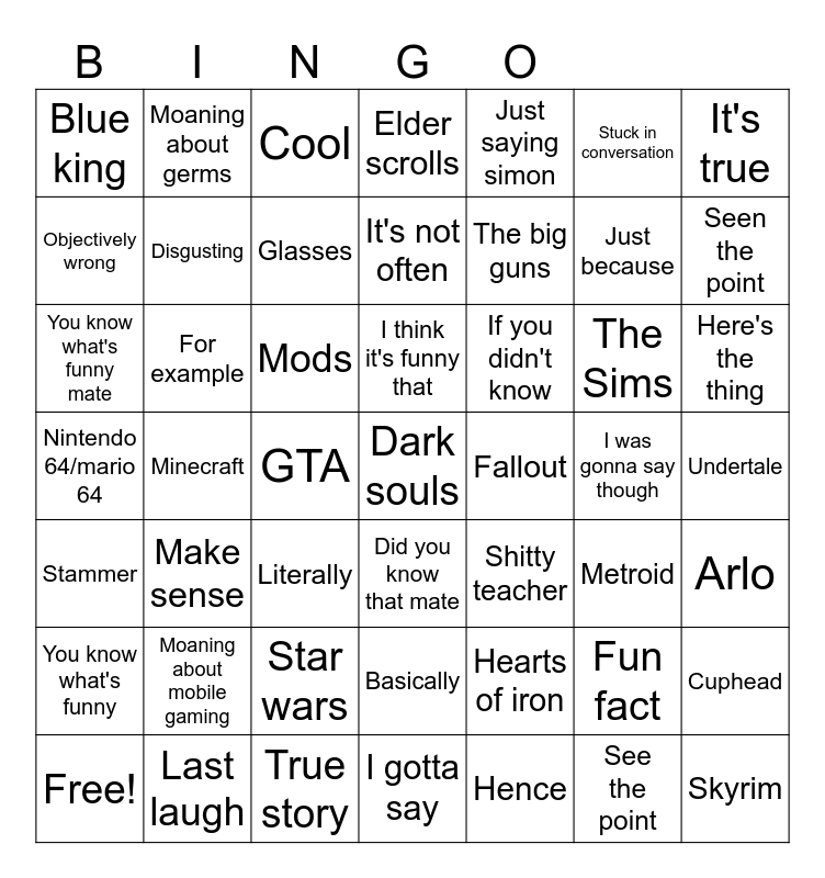 This bingo card has 49 words: Fun fact, Just because, Hence, Minecraft, Mods, Undertale, Moaning about germs, True story, Stuck in conversation, Did you know that mate, It's true, Elder scrolls, The Sims, If you didn't know, Moaning about mobile gaming, I was gonna say though, Objectively wrong, Seen the point, Cuphead, Just saying simon, The big guns, GTA, Blue king, Disgusting, Free!, Glasses, Here's the thing, Last laugh, I think it's funny that, For example, Skyrim, Fallout, You know what's funny, Star wars, Nintendo 64/mario 64, Shitty teacher, Metroid, Arlo, You know what's funny mate, Literally, Basically, Stammer, Dark souls, I gotta say, It's not often, Cool, Hearts of iron, Make sense and See the point.