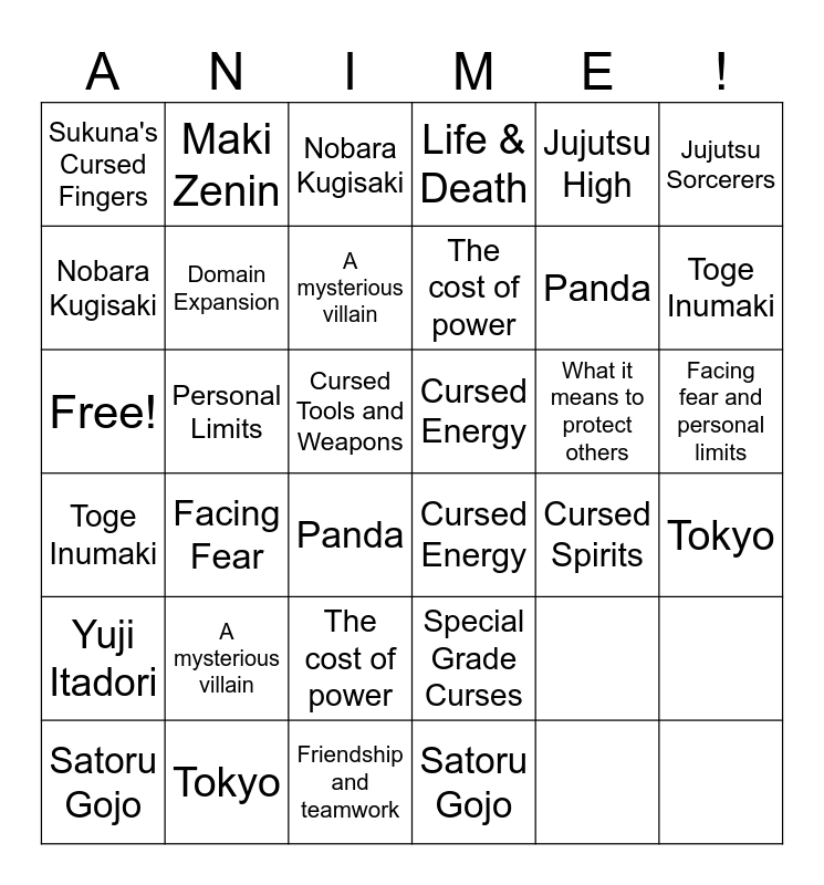 This bingo card has 45 words: Yuji Itadori, Personal Limits, Sacrifice for the greater good, Cursed Energy, Toge Inumaki, Friendship & Teamwork, A mysterious villain, What it means to protect others, Maki Zenin, Good vs. Evil, The cost of power, Free!, Facing Fear, Megumi Fushiguro, Satoru Gojo, Tokyo, Cursed Spirits, Nobara Kugisaki, Jujutsu Sorcerers, Panda, Life & Death, Yuji Itadori, Megumi Fushiguro, Nobara Kugisaki, Satoru Gojo, Panda, Toge Inumaki, Maki Zenin, A mysterious villain, Friendship and teamwork, The balance between life and death, What it means to protect others, Facing fear and personal limits, Good vs. evil, Sacrifice for the greater good, The cost of power, Cursed Energy, Cursed Spirits, Jujutsu Sorcerers, Sukuna's Cursed Fingers, Domain Expansion, Cursed Tools and Weapons, Special Grade Curses, Jujutsu High and Tokyo.