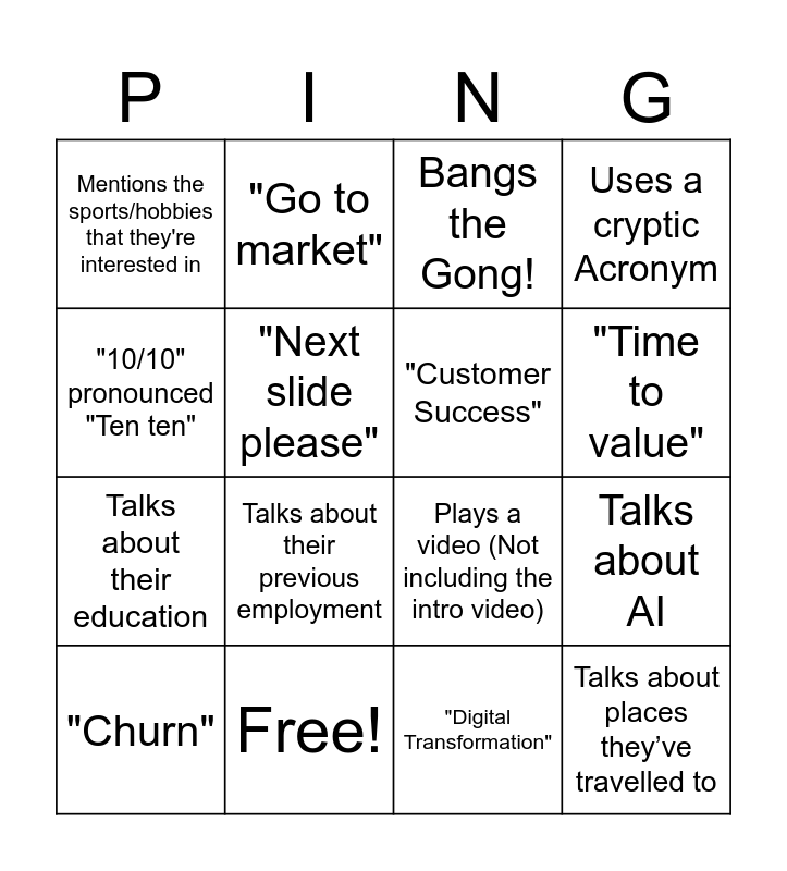 This bingo card has 22 words: Free!, Talks about their kids/family, "Go to market", Technical difficulties, "Next slide please", "Customer Success", Mentions the sports/hobbies that they're interested in, Bangs the Gong!, Plays a video (Not including the intro video), Talks about places they’ve travelled to, Talks about their education, Uses a cryptic Acronym, Pause for applause (Silently due to noise cancellation), Someone you've never heard of wins an award, "Digital Transformation", Talks about "Passwordless", Talks about AI, "Churn", Talks about their previous employment, "10/10" pronounced "Ten ten", "Time to value" and A Ping related pun (e.g. Ping into action).