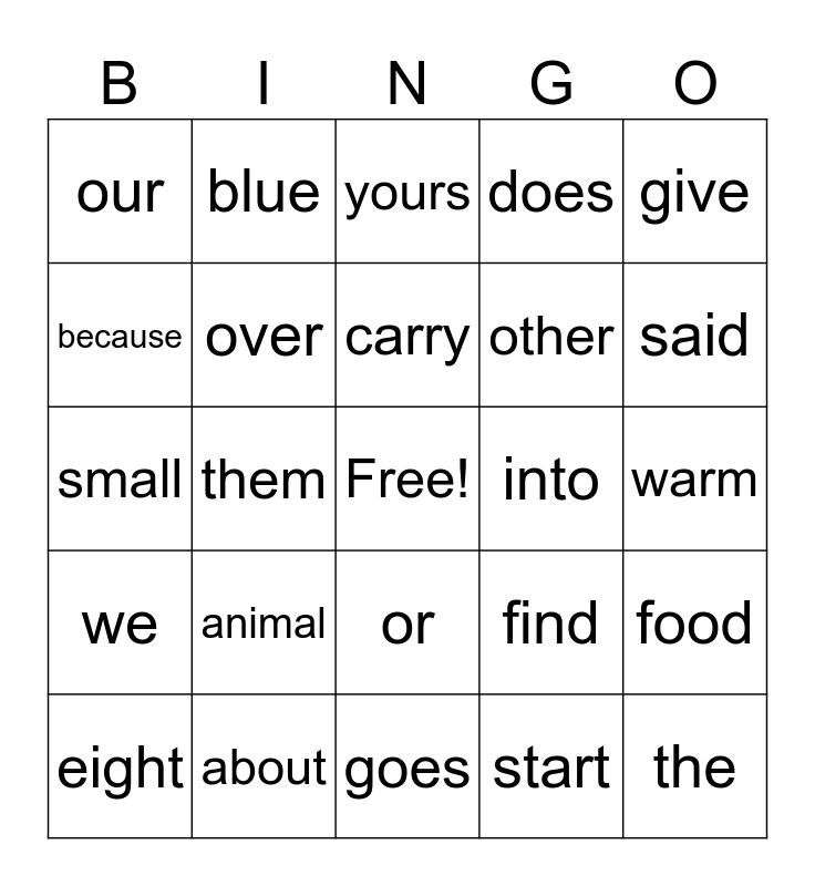 This bingo card has a free space and 24 words: animal, about, carry, eight, give, our, because, blue, into, or, other, small, find, food, over, start, warm, yours, said, them, the, we, does and goes.