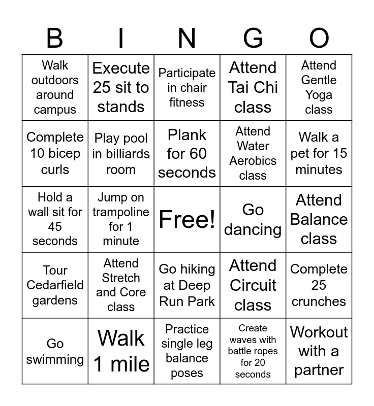 This bingo card has a free space and 24 words: Attend Stretch and Core class, Walk 1 mile, Plank for 60 seconds, Go swimming, Attend Gentle Yoga class, Walk outdoors around campus, Complete 10 bicep curls, Execute 25 sit to stands, Go dancing, Go hiking at Deep Run Park, Attend Water Aerobics class, Hold a wall sit for 45 seconds, Attend Circuit class, Complete 25 crunches, Play pool in billiards room, Create waves with battle ropes for 20 seconds, Attend Balance class, Participate in chair fitness, Walk a pet for 15 minutes, Jump on trampoline for 1 minute, Workout with a partner, Tour Cedarfield gardens, Attend Tai Chi class and Practice single leg balance poses.