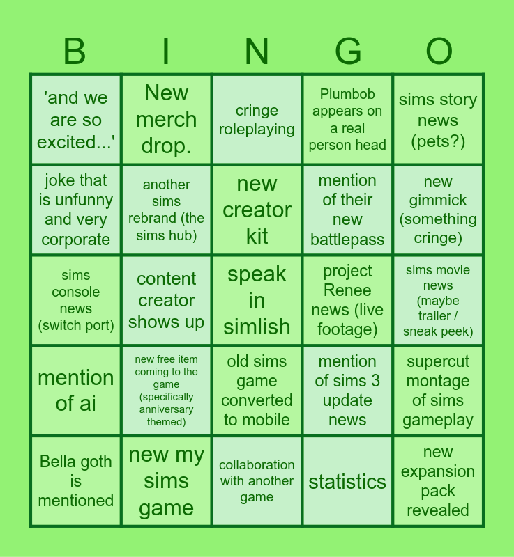 This bingo card has a free space and 24 words: Bella goth is mentioned, new free item coming to the game (specifically anniversary themed), new creator kit, statistics, sims story news (pets?), 'and we are so excited...', New merch drop., cringe roleplaying, project Renee news (live footage), sims movie news (maybe trailer / sneak peek), sims console news (switch port), another sims rebrand (the sims hub), mention of sims 3 update news, supercut montage of sims gameplay, joke that is unfunny and very corporate, new my sims game, collaboration with another game, Plumbob appears on a real person head, new gimmick (something cringe), mention of ai, content creator shows up, old sims game converted to mobile, mention of their new battlepass and new expansion pack revealed.