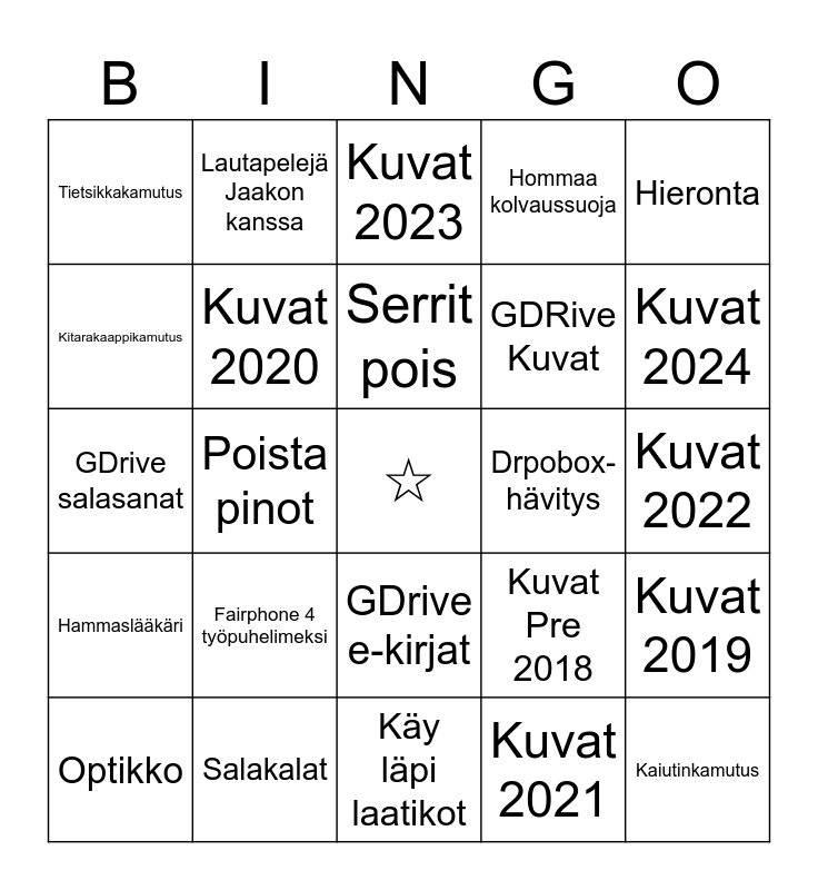 This bingo card has a free space and 24 words: Fairphone 4 työpuhelimeksi, Salakalat, Serrit pois, Optikko, Hieronta, Tietsikkakamutus, Kitarakaappikamutus, Lautapelejä Jaakon kanssa, Drpobox-hävitys, GDrive e-kirjat, GDRive Kuvat, GDrive salasanat, Kuvat Pre 2018, Kuvat 2019, Kuvat 2020, Kuvat 2021, Kuvat 2022, Kuvat 2023, Kuvat 2024, Poista pinot, Kaiutinkamutus, Hammaslääkäri, Hommaa kolvaussuoja and Käy läpi laatikot.