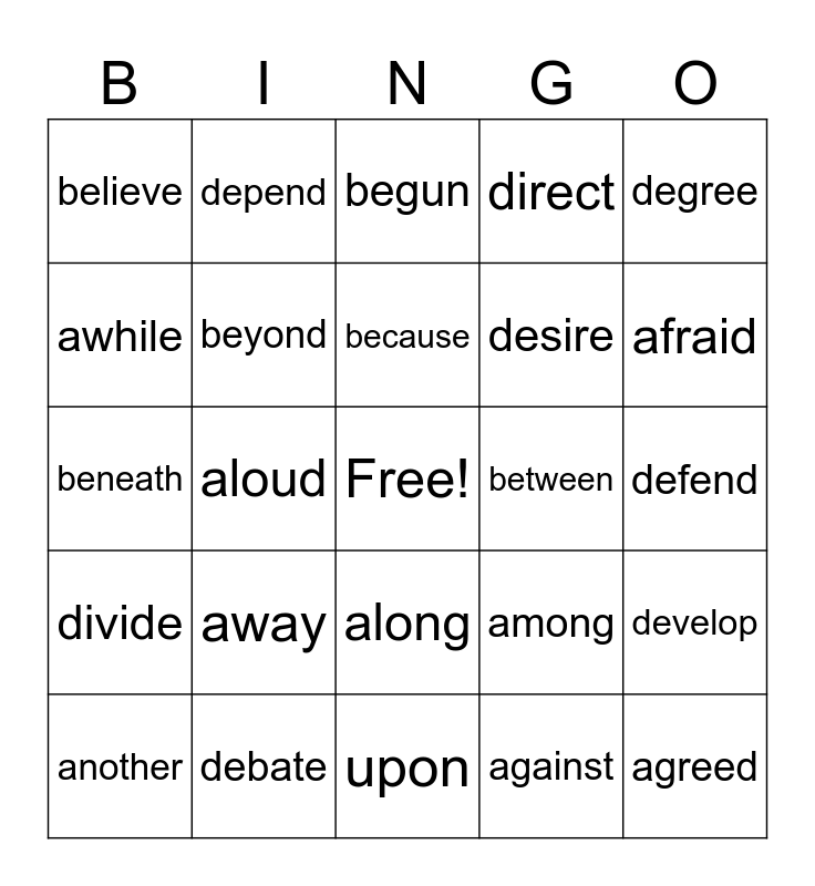 This bingo card has a free space and 24 words: away, debate, because, another, degree, believe, awhile, depend, between, along, desire, beneath, among, develop, beyond, against, defend, begun, afraid, aloud, agreed, divide, direct and upon.
