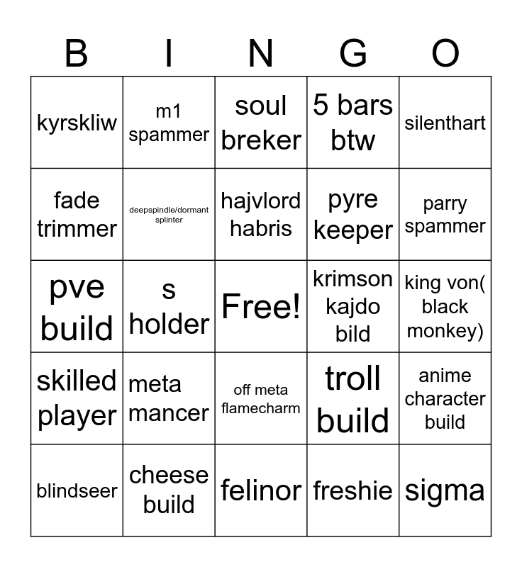 This bingo card has a free space and 24 words: meta mancer, cheese build, hajvlord habris, blindseer, silenthart, kyrskliw, fade trimmer, m1 spammer, krimson kajdo bild, off meta flamecharm, pyre keeper, pve build, troll build, anime character build, deepspindle/dormant splinter, freshie, king von( black monkey), soul breker, parry spammer, s holder, sigma, skilled player, 5 bars btw and felinor.