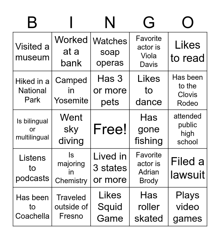 This bingo card has a free space and 29 words: Has been to Coachella, Got a speeding ticket, Went sky diving, Has three siblings or more, Visited a museum, Watches soap operas, Camped in Yosemite, Is majoring in Chemistry, Has gone fishing, Traveled outside of Fresno, attended public high school, Plays video games, Likes Squid Game, Has roller skated, Has been to the Clovis Rodeo, Born outside of Fresno, Lived in 3 states or more, Listens to podcasts, Likes to read, Is bilingual or multilingual, Favorite actor is Adrian Brody, Played sports in high school, Likes to dance, Hiked in a National Park, Favorite actor is Viola Davis, Worked at a bank, Filed a lawsuit, Has 3 or more pets and Visited a zoo.