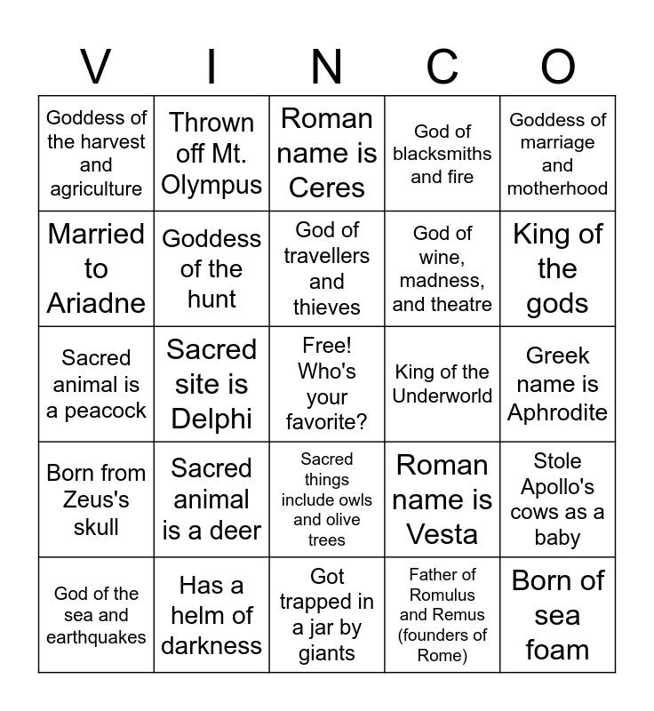 This bingo card has a free space and 29 words: God of the sea and earthquakes, Carries a trident, Sacred site is Delphi, Twin brother of Diana, Goddess of the harvest and agriculture, Roman name is Ceres, Goddess of the hunt, Sacred animal is a deer, King of the Underworld, Has a helm of darkness, Greek name is Aphrodite, Born of sea foam, Got trapped in a jar by giants, Father of Romulus and Remus (founders of Rome), King of the gods, Symbol is a lightning bolt, Sacred things include owls and olive trees, Born from Zeus's skull, Goddess of marriage and motherhood, Sacred animal is a peacock, Roman name is Vesta, Goddess of the hearth and home, God of wine, madness, and theatre, Married to Ariadne, God of blacksmiths and fire, Thrown off Mt. Olympus, Stole Apollo's cows as a baby, God of travellers and thieves and Symbol is a bow and arrow.