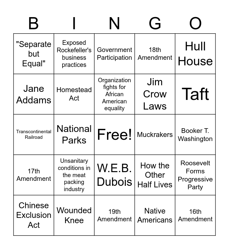 This bingo card has a free space and 24 words: Unsanitary conditions in the meat packing industry, Wounded Knee, Organization fights for African American equality, Chinese Exclusion Act, Hull House, "Separate but Equal", Jane Addams, Exposed Rockefeller's business practices, Muckrakers, W.E.B. Dubois, Jim Crow Laws, Transcontinental Railroad, How the Other Half Lives, Roosevelt Forms Progressive Party, Homestead Act, Native Americans, Booker T. Washington, Government Participation, Taft, National Parks, 16th Amendment, 17th Amendment, 18th Amendment and 19th Amendment.