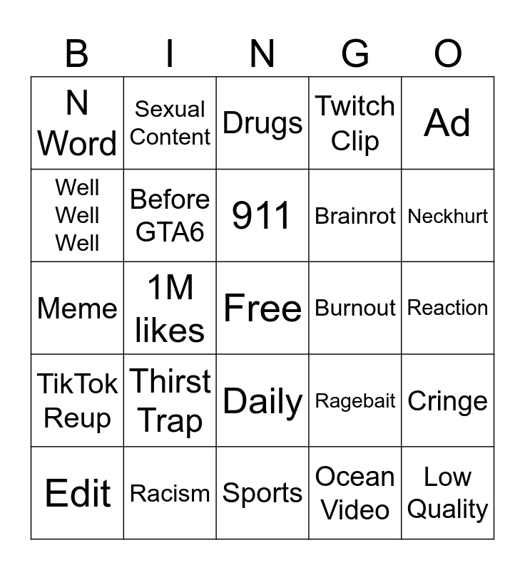 This bingo card has a free space and 24 words: Thirst Trap, Racism, 911, Edit, Ad, N Word, Well Well Well, Sexual Content, Burnout, Daily, Brainrot, Meme, Ragebait, Cringe, Before GTA6, Ocean Video, Reaction, Drugs, Neckhurt, 1M likes, Low Quality, TikTok Reup, Twitch Clip and Sports.
