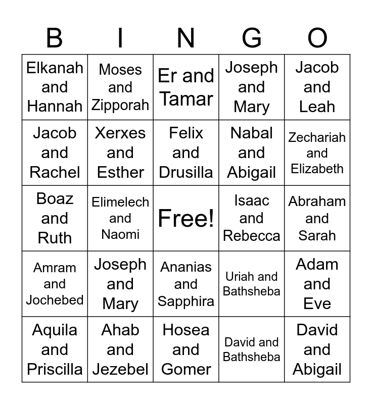 This bingo card has a free space and 24 words: Joseph and Mary, Ahab and Jezebel, Felix and Drusilla, Aquila and Priscilla, Jacob and Leah, Elkanah and Hannah, Jacob and Rachel, Moses and Zipporah, Isaac and Rebecca, Ananias and Sapphira, Nabal and Abigail, Boaz and Ruth, Uriah and Bathsheba, Adam and Eve, Xerxes and Esther, David and Bathsheba, Abraham and Sarah, Er and Tamar, Zechariah and Elizabeth, Elimelech and Naomi, David and Abigail, Amram and Jochebed, Joseph and Mary and Hosea and Gomer.