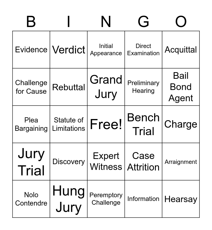 This bingo card has a free space and 24 words: Discovery, Hung Jury, Grand Jury, Nolo Contendre, Acquittal, Evidence, Challenge for Cause, Verdict, Bench Trial, Expert Witness, Preliminary Hearing, Plea Bargaining, Case Attrition, Arraignment, Rebuttal, Information, Charge, Initial Appearance, Bail Bond Agent, Statute of Limitations, Hearsay, Jury Trial, Direct Examination and Peremptory Challenge.