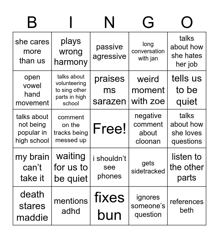 This bingo card has a free space and 24 words: waiting for us to be quiet, mentions adhd, praises ms sarazen, death stares maddie, talks about how she hates her job, she cares more than us, open vowel hand movement, plays wrong harmony, negative comment about cloonan, i shouldn’t see phones, weird moment with zoe, talks about not being popular in high school, gets sidetracked, listen to the other parts, talks about volunteering to sing other parts in high school, ignores someone’s question, talks about how she loves questions, passive agressive, tells us to be quiet, comment on the tracks being messed up, references beth, my brain can’t take it, long conversation with jan and fixes bun.
