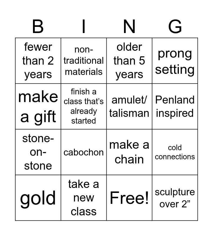 This bingo card has 17 words: Free!, gold, older than 5 years, fewer than 2 years, cabochon, prong setting, cold connections, amulet/ talisman, Penland inspired, finish a class that’s already started, take a new class, make a chain, make a gift, non-traditional materials, stone-on-stone, sculpture under 2” and sculpture over 2”.