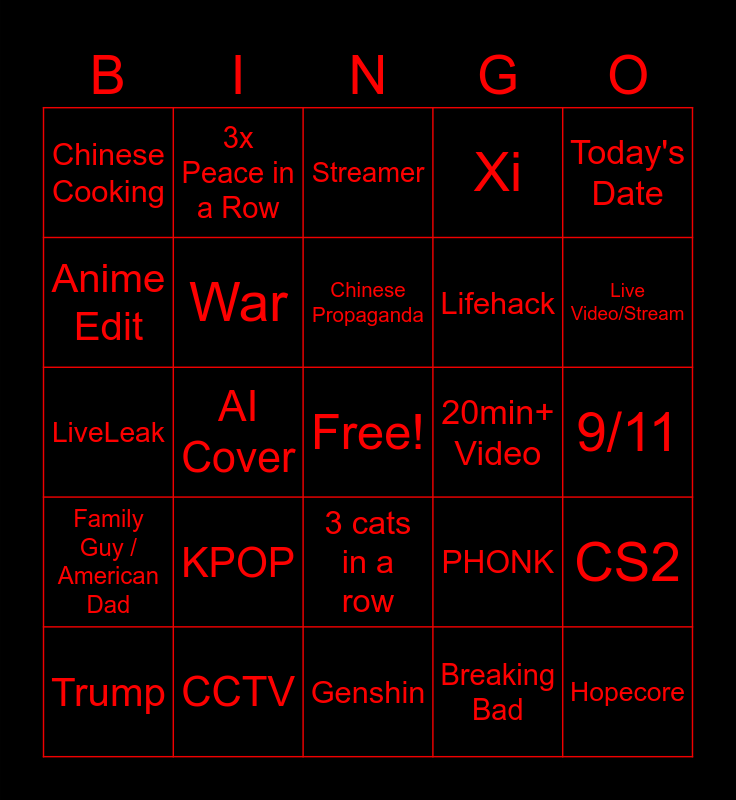 This bingo card has a free space and 24 words: KPOP, CCTV, Chinese Propaganda, Trump, Today's Date, Chinese Cooking, Anime Edit, 3x Peace in a Row, 20min+ Video, 3 cats in a row, Lifehack, LiveLeak, PHONK, CS2, War, Breaking Bad, 9/11, Streamer, Live Video/Stream, AI Cover, Hopecore, Family Guy / American Dad, Xi and Genshin.