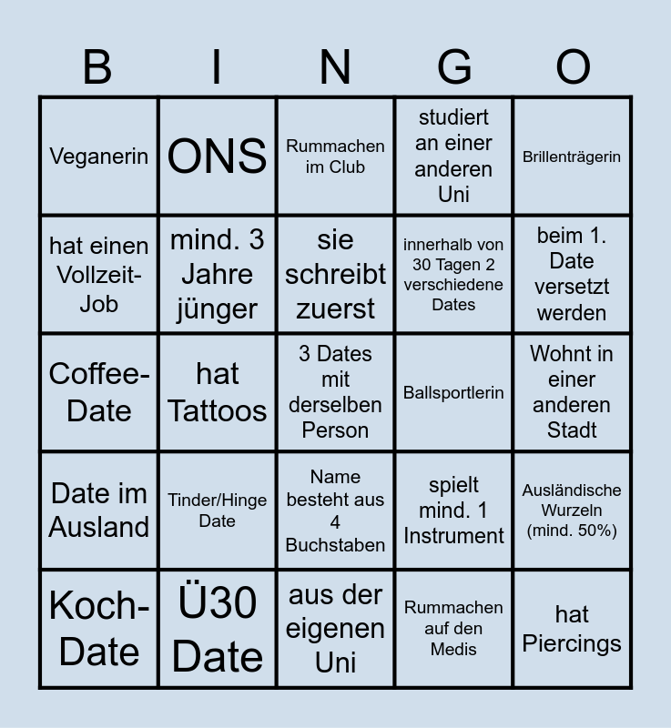 This bingo card has 25 words: Tinder/Hinge Date, aus der eigenen Uni, sie schreibt zuerst, Koch-Date, Brillenträgerin, Veganerin, hat einen Vollzeit-Job, ONS, Ballsportlerin, Name besteht aus 4 Buchstaben, innerhalb von 30 Tagen 2 verschiedene Dates, Coffee-Date, spielt mind. 1 Instrument, Ausländische Wurzeln (mind. 50%), mind. 3 Jahre jünger, hat Piercings, Wohnt in einer anderen Stadt, Rummachen im Club, beim 1. Date versetzt werden, hat Tattoos, 3 Dates mit derselben Person, Ü30 Date, Date im Ausland, studiert an einer anderen Uni and Rummachen auf den Medis.
