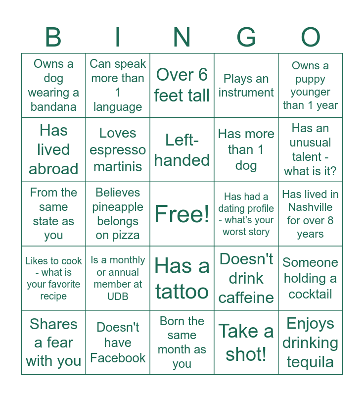This bingo card has a free space and 24 words: Is a monthly or annual member at UDB, Doesn't have Facebook, Left-handed, Shares a fear with you, Owns a puppy younger than 1 year, Owns a dog wearing a bandana, Has lived abroad, Can speak more than 1 language, Has had a dating profile - what's your worst story, Has a tattoo, Has more than 1 dog, From the same state as you, Doesn't drink caffeine, Someone holding a cocktail, Loves espresso martinis, Take a shot!, Has lived in Nashville for over 8 years, Over 6 feet tall, Has an unusual talent - what is it?, Believes pineapple belongs on pizza, Enjoys drinking tequila, Likes to cook - what is your favorite recipe, Plays an instrument and Born the same month as you.