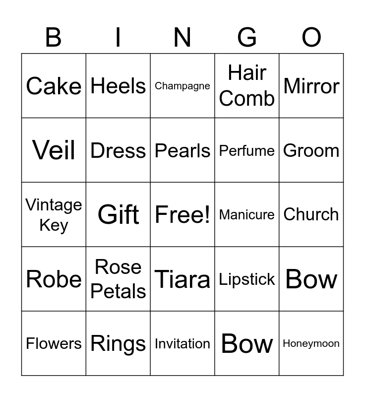 This bingo card has a free space and 24 words: Rose Petals, Rings, Pearls, Flowers, Mirror, Cake, Veil, Heels, Manicure, Tiara, Perfume, Vintage Key, Lipstick, Bow, Dress, Bow, Church, Champagne, Groom, Gift, Honeymoon, Robe, Hair Comb and Invitation.