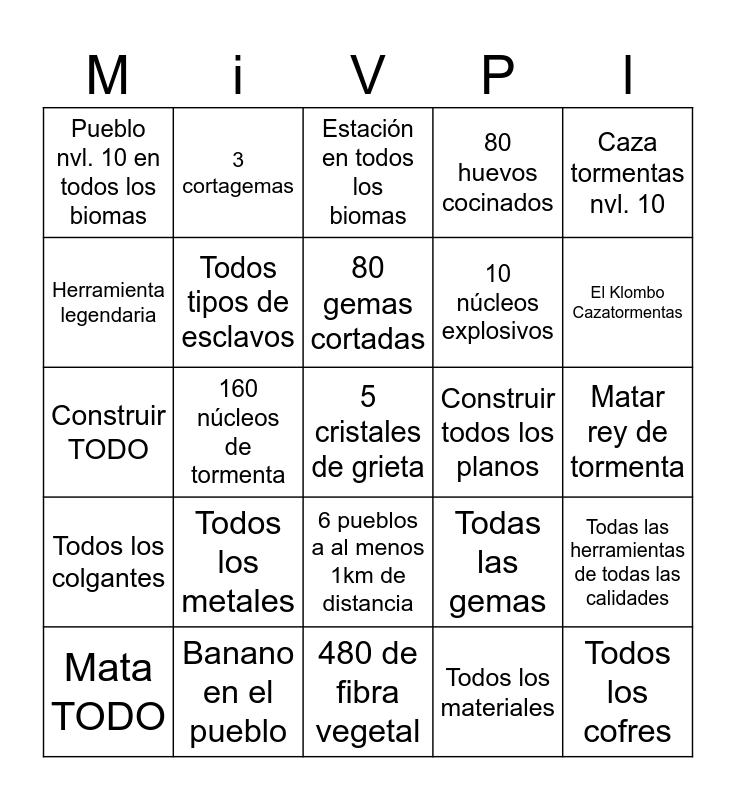 This bingo card has 25 words: Todos los metales, 480 de fibra vegetal, 80 gemas cortadas, Mata TODO, Caza tormentas nvl. 10, Pueblo nvl. 10 en todos los biomas, Herramienta legendaria, 3 cortagemas, Construir todos los planos, 6 pueblos a al menos 1km de distancia, 10 núcleos explosivos, Construir TODO, Todas las gemas, Todas las herramientas de todas las calidades, Todos tipos de esclavos, Todos los cofres, Matar rey de tormenta, Estación en todos los biomas, El Klombo Cazatormentas, 160 núcleos de tormenta, 5 cristales de grieta, Banano en el pueblo, Todos los colgantes, 80 huevos cocinados and Todos los materiales.