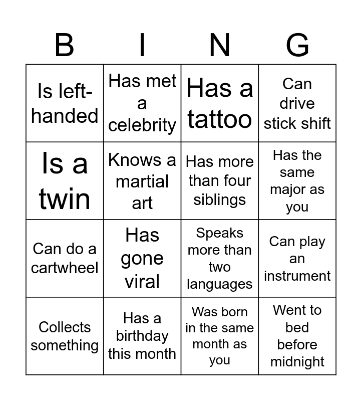 This bingo card has 16 words: Has a birthday this month, Can play an instrument, Has a tattoo, Is left-handed, Can do a cartwheel, Has met a celebrity, Speaks more than two languages, Was born in the same month as you, Is a twin, Knows a martial art, Collects something, Can drive stick shift, Has gone viral, Has the same major as you, Has more than four siblings and Went to bed before midnight.