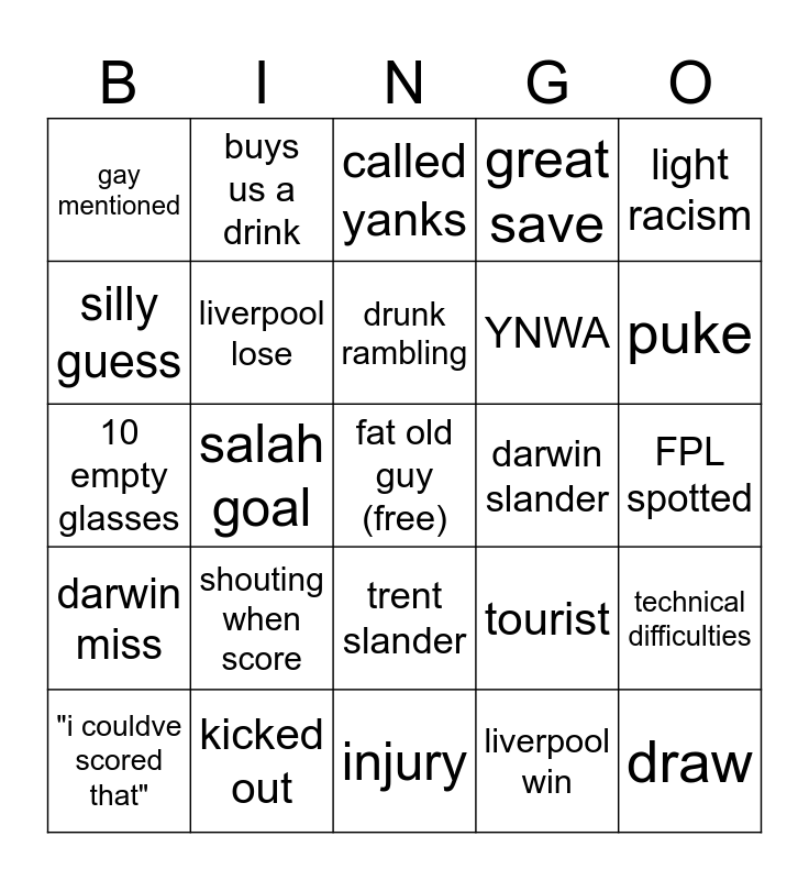 This bingo card has a free space and 24 words: shouting when score, kicked out, drunk rambling, "i couldve scored that", light racism, gay mentioned, silly guess, buys us a drink, darwin slander, trent slander, YNWA, 10 empty glasses, tourist, technical difficulties, liverpool lose, liverpool win, FPL spotted, called yanks, puke, salah goal, draw, darwin miss, great save and injury.