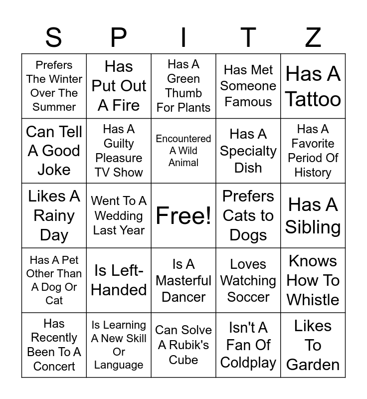 This bingo card has a free space and 54 words: Has Worked At Spitz For 3+ Years, Has A Pet Other Than A Dog Or Cat, Loves Spicy Food, Has A Hidden Talent, Is A Masterful Dancer, Knows How To Skateboard, Has Met Someone Famous, Speaks With Their Hands, Can Tell A Good Joke, Has Run A Marathon, Prefers The Winter Over The Summer, Loves To Read, Is Learning A New Skill Or Language, Has Recently Been To A Concert, Loves Breakfast Food, Can Solve A Rubik's Cube, Likes To Garden, Has A Specialty Dish, Loves Chocolate, Has A Sibling, Loves Watching Soccer, Is Wearing Something Blue, Prefers Cats to Dogs, Has A Tattoo, Has A Favorite Superhero, Has Put Out A Fire, Plays An Instrument, Can Bake A Cake, Knows The Spitz NE WiFi Password, Isn't A Fan Of Coldplay, Has Broken A Glass At Work, Wears Glasses, Owns More Than 3+ Pairs Of Sneakers, Drinks Tea More Than Coffee, Has A Green Thumb For Plants, Draws and Doodles, Likes A Rainy Day, Knows How To Whistle, Prefers Driving Over Flying, Has A Guilty Pleasure TV Show, Can Do A Celebrity Impression, Remebers Their First Concert, Has A Collection Of Something, Loves Horror Movies, Is Left-Handed, Has Lived In Another Country, Accidently Sent A Text To A Wrong Person, Can Name All The Planets In The Solar System, Encountered A Wild Animal, Went To A Wedding Last Year, Has A Favorite Period Of History, Hasn't Broken A Bone, Chooses Dare Over Truth and Performed In Front Of A Crowd.