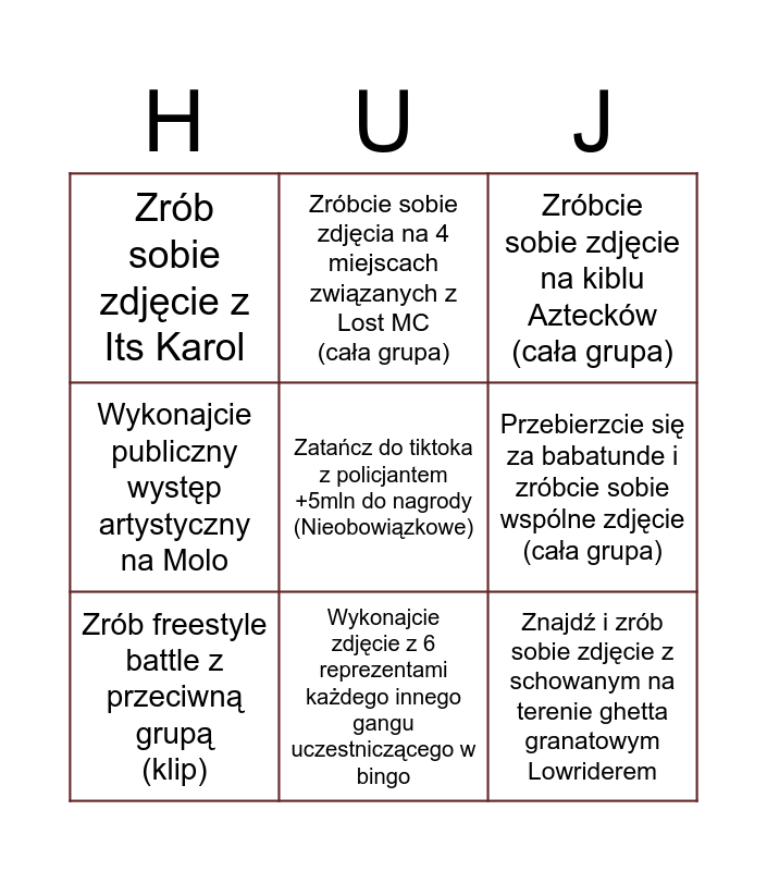 This bingo card has a free space and 8 words: Przebierzcie się za babatunde i zróbcie sobie wspólne zdjęcie (cała grupa), Zróbcie sobie zdjęcie na kiblu Aztecków (cała grupa), Zróbcie sobie zdjęcia na 4 miejscach związanych z Lost MC (cała grupa), Zrób freestyle battle z przeciwną grupą (klip), Zrób sobie zdjęcie z Its Karol, Znajdź i zrób sobie zdjęcie z schowanym na terenie ghetta granatowym Lowriderem, Wykonajcie publiczny występ artystyczny na Molo and Wykonajcie zdjęcie z 6 reprezentami każdego innego gangu uczestniczącego w bingo.