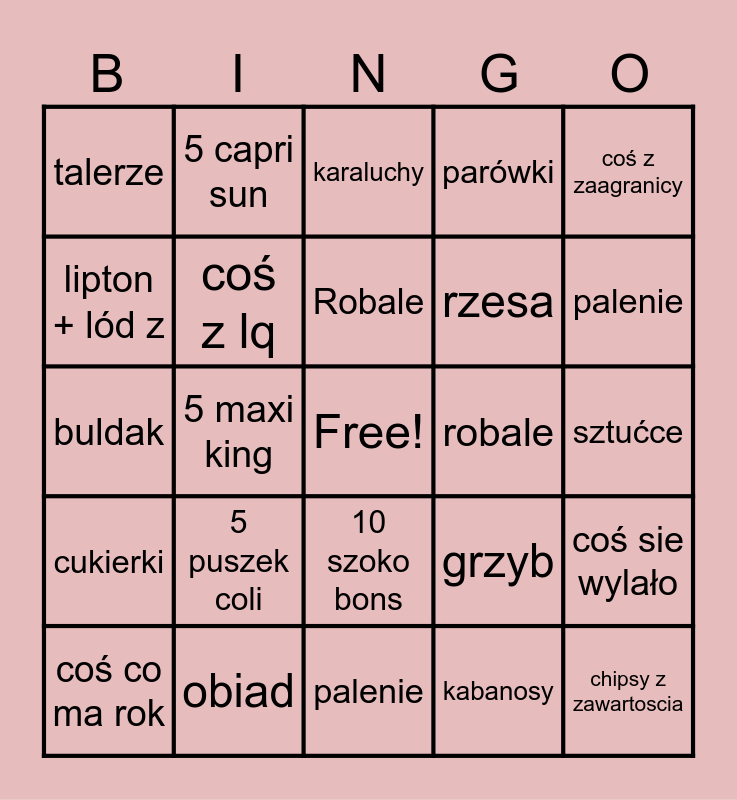 This bingo card has a free space and 24 words: 5 puszek coli, obiad, Robale, coś co ma rok, coś z zaagranicy, talerze, lipton + lód z, 5 capri sun, robale, 10 szoko bons, rzesa, buldak, grzyb, coś sie wylało, coś z lq, kabanosy, sztućce, karaluchy, palenie, 5 maxi king, chipsy z zawartoscia, cukierki, parówki and palenie.