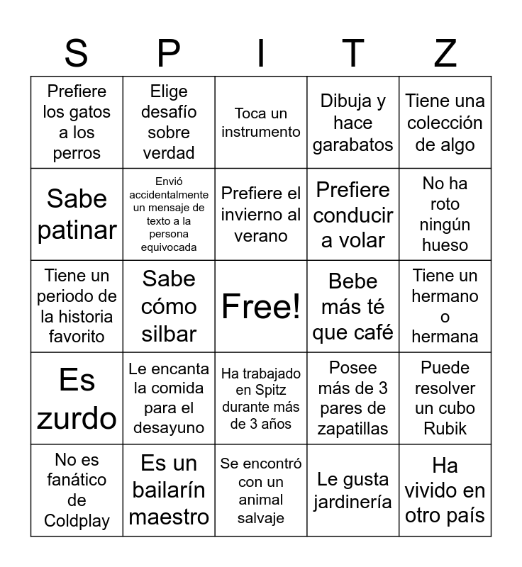 This bingo card has a free space and 54 words: Ha apagado un fuego, Es zurdo, Puede hornear un pastel, Ha ido recientemente a un concierto, Ha trabajado en Spitz durante más de 3 años, Le encanta leer, Dibuja y hace garabatos, Le gusta un día lluvioso, Sabe patinar, Puede contar un buen chiste, Prefiere los gatos a los perros, Puede nombrar todos los planetas del sistema solar, Es un bailarín maestro, No es fanático de Coldplay, Recuerda su primer concierto, Se encontró con un animal salvaje, Ha vivido en otro país, Prefiere conducir a volar, Ha roto un vaso en el trabajo, Tiene un hermano o hermana, Posee más de 3 pares de zapatillas, Tiene una mascota que no es un perro ni un gato, Bebe más té que café, Tiene una colección de algo, Ha corrido un maratón, Elige desafío sobre verdad, Le encantan las películas de terror, Le encanta el chocolate, Tiene un superhéroe favorito, Le gusta jardinería, Usa gafas, Tiene un talento oculto, Tiene un programa de TV de placer culpable, Tiene un plato especial, Toca un instrumento, Ha actuado frente a una multitud, Tiene un periodo de la historia favorito, Puede resolver un cubo Rubik, Puede hacer una imitación de una celebridad, Envió accidentalmente un mensaje de texto a la persona equivocada, Tiene el pulgar verde para las plantas, Habla con las manos, Sabe la contraseña del Wi-Fi de Spitz NE, Está aprendiendo una nueva habilidad o idioma, Le encanta la comida para el desayuno, Está usando algo azul, Le encanta la comida picante, Tiene un tatuaje, Prefiere el invierno al verano, Sabe cómo silbar, No ha roto ningún hueso, Le encanta ver fútbol, Ha conocido a alguien famoso and Fue a una boda el año pasado.
