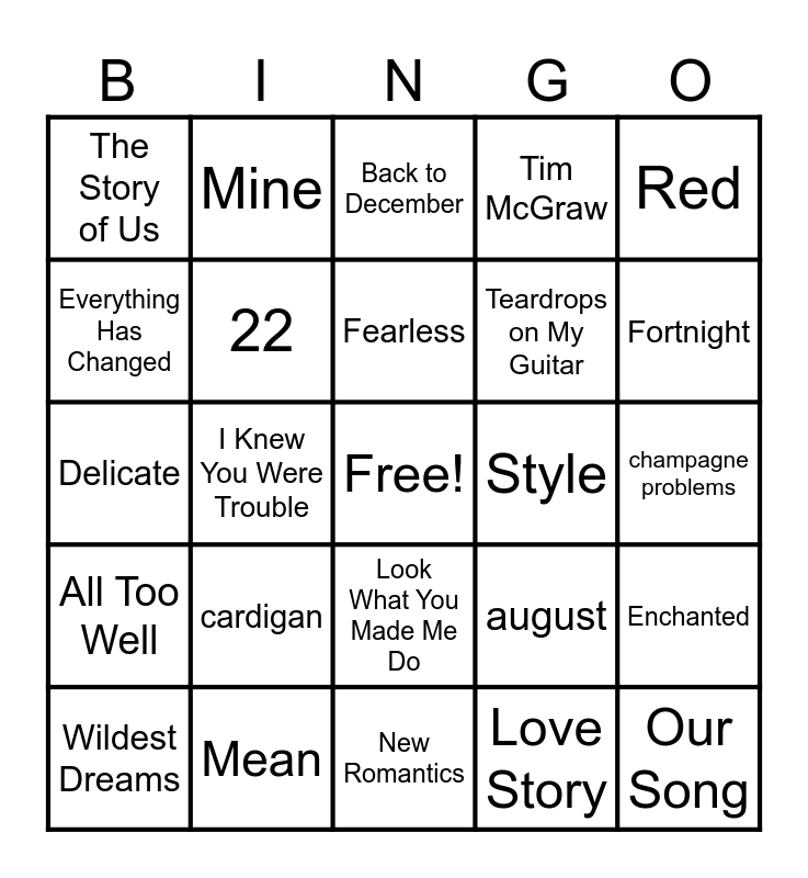 This bingo card has a free space and 32 words: Love Story, You Belong with Me, I Knew You Were Trouble, We Are Never Ever Getting Back Together, All Too Well, 22, Red, Enchanted, Mine, Sparks Fly, Fearless, Back to December, Shake It Off, Blank Space, Style, Bad Blood, Wildest Dreams, Delicate, Look What You Made Me Do, cardigan, august, willow, champagne problems, Mean, Our Song, Tim McGraw, Teardrops on My Guitar, Everything Has Changed, The Story of Us, New Romantics, Out of the Woods and Fortnight.