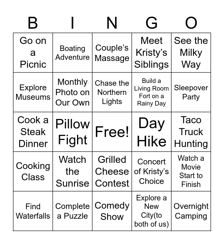 This bingo card has a free space and 24 words: Watch the Sunrise, Complete a Puzzle, Chase the Northern Lights, Find Waterfalls, See the Milky Way, Go on a Picnic, Explore Museums, Boating Adventure, Day Hike, Grilled Cheese Contest, Build a Living Room Fort on a Rainy Day, Cook a Steak Dinner, Concert of Kristy’s Choice, Watch a Movie Start to Finish, Monthly Photo on Our Own, Explore a New City(to both of us), Taco Truck Hunting, Couple’s Massage, Sleepover Party, Pillow Fight, Overnight Camping, Cooking Class, Meet Kristy’s Siblings and Comedy Show.