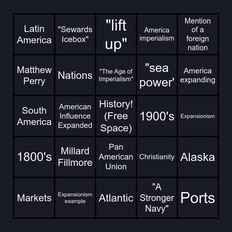 This bingo card has a free space and 70 words: Isolationism, Expansionism, Imperialism, Isolationism example, Expansionism example, America, America imperialism, Mention of Japan, Mention of a foreign nation, Presidential, Alaska, "American Empire", Latin America, "lift up", D.C, American Influence Expanded, Pan American Union, "sea power', US Navy, 1800's, 1900's, Christianity, America expanding, Alaska Map, Any Map, The Purchase of Alaska, "Lifting Up" the World, "American Interest in Latin America", "A Stronger Navy", Sails to Steams, "Sewards Icebox", George Washington, Russia, Gold in Alaska, $7.2 Million, Political Growth, Economic Growth, Raw Materials, Manifest Destiny, Matthew Perry, Trade, Millard Fillmore, Ports, Shipping, Warships, Nations, Markets, Control, Asia, Africa, WWI, Competition, Purchase, Pacfic, Atlantic, 1912, "The Age of Imperialism", "Changing Foreign Policy", Europe, North America, South America, Super Power, World Power, Hard Power, Soft Power, Chapter 23, Page 634, Page 637, Policy and Intrest.