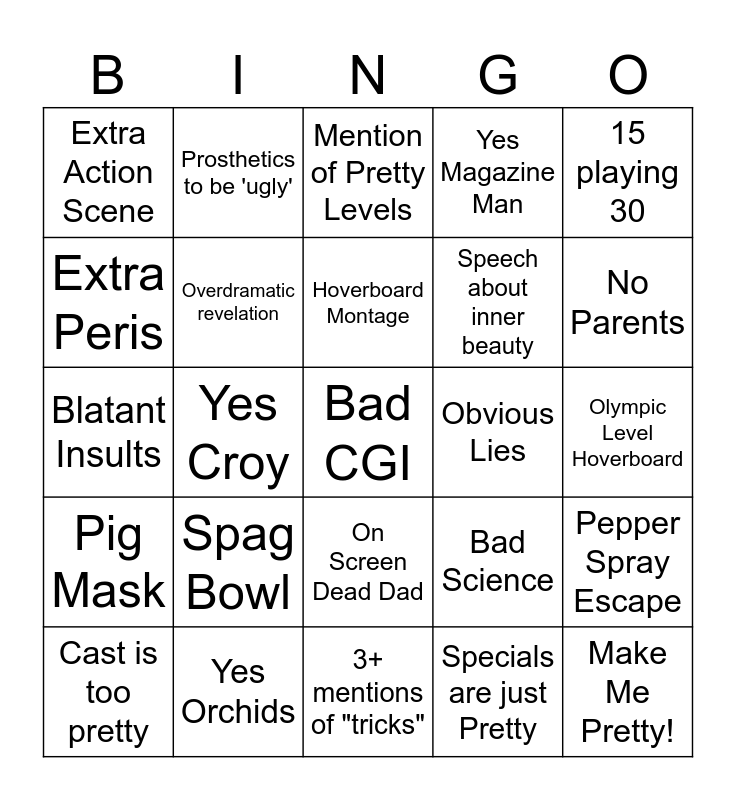 This bingo card has a free space and 25 words: Spag Bowl, 3+ mentions of "tricks", Hoverboard Montage, Cast is too pretty, 15 playing 30, Extra Action Scene, Extra Peris, Prosthetics to be 'ugly', Obvious Lies, On Screen Dead Dad, Speech about inner beauty, Blatant Insults, Bad Science, Pepper Spray Escape, Overdramatic revelation, If we do this, we'll be just like them!!!, Olympic Level Hoverboard, Mention of Pretty Levels, No Parents, Yes Croy, Make Me Pretty!, Yes Orchids, Pig Mask, Yes Magazine Man and Specials are just Pretty.