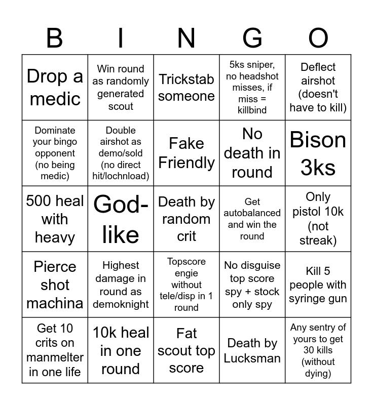 This bingo card has a free space and 24 words: Highest damage in round as demoknight, 10k heal in one round, Fake Friendly, Get 10 crits on manmelter in one life, Deflect airshot (doesn't have to kill), Drop a medic, Dominate your bingo opponent (no being medic), Win round as randomly generated scout, Get autobalanced and win the round, Topscore engie without tele/disp in 1 round, No death in round, 500 heal with heavy, No disguise top score spy + stock only spy, Kill 5 people with syringe gun, Double airshot as demo/sold (no direct hit/lochnload), Death by Lucksman, Only pistol 10k (not streak), Trickstab someone, Bison 3ks, God-like, Any sentry of yours to get 30 kills (without dying), Pierce shot machina, 5ks sniper, no headshot misses, if miss = killbind and Fat scout top score.