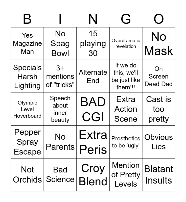 This bingo card has a free space and 25 words: No Parents, Croy Blend, Alternate End, Not Orchids, No Mask, Yes Magazine Man, Specials Harsh Lighting, No Spag Bowl, Extra Action Scene, Extra Peris, If we do this, we'll be just like them!!!, Olympic Level Hoverboard, Prosthetics to be 'ugly', Obvious Lies, 3+ mentions of "tricks", Hoverboard Montage, Cast is too pretty, 15 playing 30, On Screen Dead Dad, Speech about inner beauty, Blatant Insults, Bad Science, Pepper Spray Escape, Overdramatic revelation and Mention of Pretty Levels.
