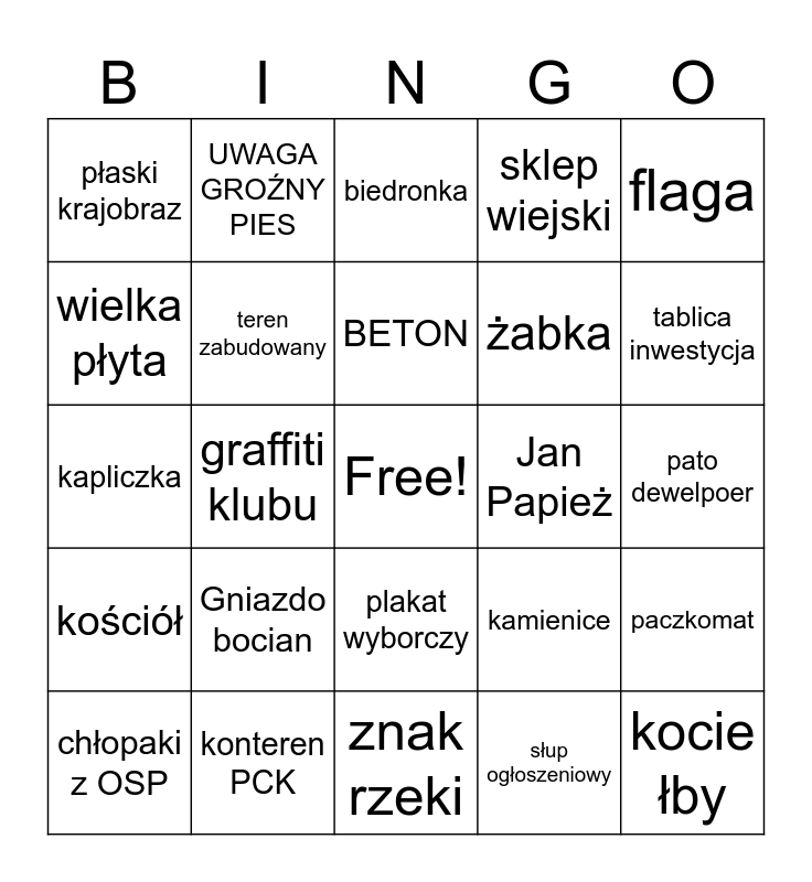 This bingo card has a free space and 24 words: Gniazdo bocian, konteren PCK, BETON, chłopaki z OSP, flaga, płaski krajobraz, wielka płyta, UWAGA GROŹNY PIES, Jan Papież, plakat wyborczy, żabka, kapliczka, kamienice, paczkomat, teren zabudowany, słup ogłoszeniowy, pato dewelpoer, biedronka, tablica inwestycja, graffiti klubu, kocie łby, kościół, sklep wiejski and znak rzeki.