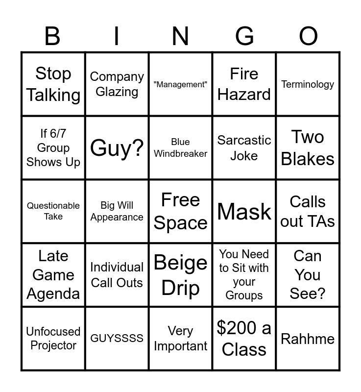 This bingo card has a free space and 25 words: Individual Call Outs, Very Important, Blue Windbreaker, Unfocused Projector, Terminology, Stop Talking, If 6/7 Group Shows Up, Company Glazing, Mask, Beige Drip, Sarcastic Joke, Questionable Take, You Need to Sit with your Groups, Can You See?, Guy?, Shaky Hands, Calls out TAs, "Management", Two Blakes, Big Will Appearance, Rahhme, GUYSSSS, Late Game Agenda, Fire Hazard and $200 a Class.