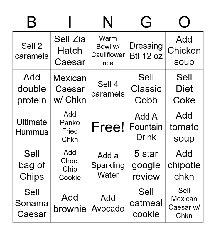This bingo card has a free space and 24 words: Add Choc. Chip Cookie, Add brownie, Sell 4 caramels, Sell Sonama Caesar, Add Chicken soup, Sell 2 caramels, Add double protein, Sell Zia Hatch Caesar, Add A Fountain Drink, Add a Sparkling Water, Sell Classic Cobb, Ultimate Hummus, 5 star google review, Add chipotle chkn, Mexican Caesar w/ Chkn, Sell oatmeal cookie, Add tomato soup, Warm Bowl w/ Cauliflower rice, Sell Diet Coke, Add Panko Fried Chkn, Sell Mexican Caesar w/ Chkn, Sell bag of Chips, Dressing Btl 12 oz and Add Avocado.