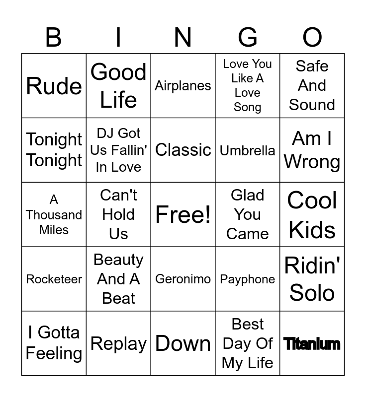 This bingo card has a free space and 27 words: Payphone, Beautiful, Umbrella, Down, Tonight Tonight, Airplanes, Good Life, Rocketeer, Glad You Came, Ridin' Solo, A Thousand Miles, Love You Like A Love Song, I Gotta Feeling, Replay, Am I Wrong, Dynamite, DJ Got Us Fallin' In Love, Classic, Beauty And A Beat, Rude, Cool Kids, Best Day Of My Life, Can't Hold Us, Titanium, Geronimo, Safe And Sound and Burn.