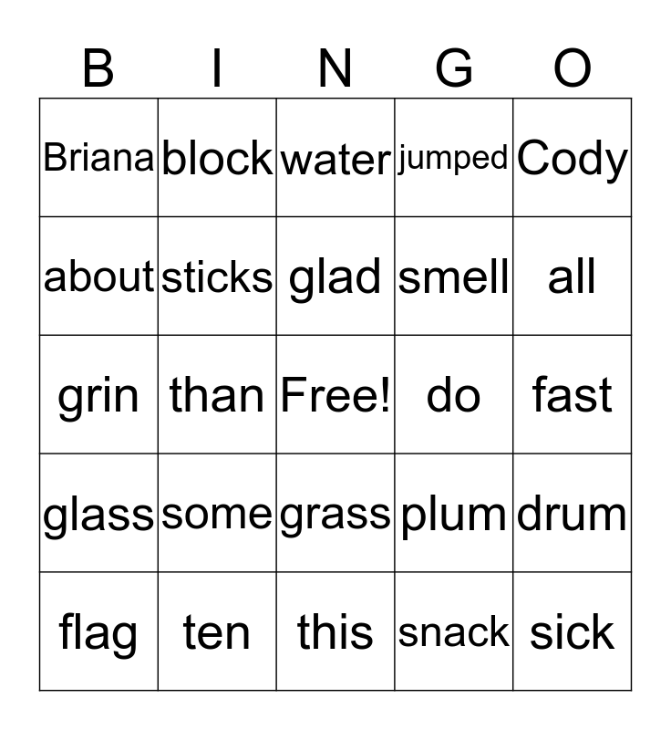 This bingo card has a free space and 35 words: six, yes, clock, sticks, grass, jumped, about, fastest, glad, jump, grin, Cody, Chanelle, Haidley, Briana, do, snack, than, glass, sick, plum, flag, drum, ten, water, all, peach, faster, smell, fast, plan, this, some, block and what.
